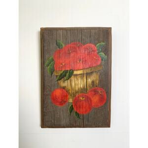 Vintage 1971 Hand-Painted Wooden Painting Apples in Basket Rustic Farmhouse Art