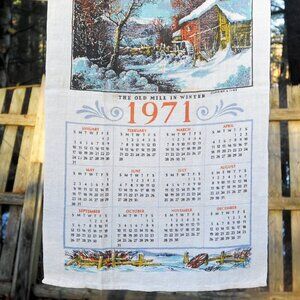 Vintage 1971 Linen Calendar Towel 'Old Mill in Winter' Currier & Ives Watermill