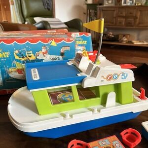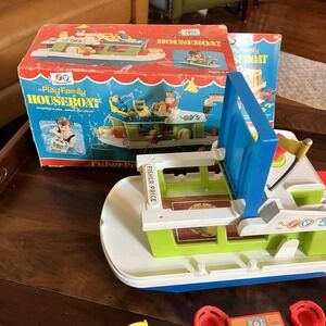 Set sail on a sea of vintage charm with this 1972 Fisher Price Play Family Houseboat #985