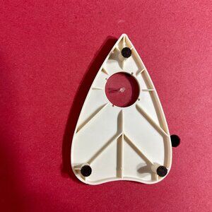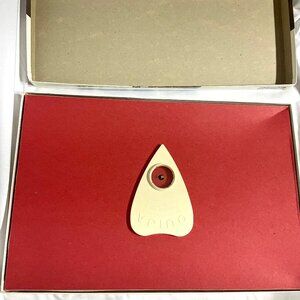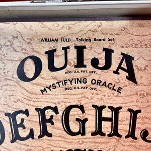 The William Fuld Talking Board Set, Ouija Mystifying Oracle from Parker Brothers. Has the box, the Ouija Message Indicator, the board to hold the message indicator, the Ouija Board, and the paper that tells you how to apply the flelt protectors to the message indicator. I took pictures of all sides and they are part of this description.