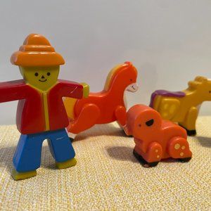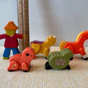 Vintage Fisher-Price Baby Mobile #166 farm pieces only – scarecrow, horse, cow, sheep, and pig. Sweet farm life pieces can be used for DYI crafting. Each cute little piece has an opening for a string to hang, can be set as a stationary display, or used as replacement parts for the mobile. Colorful parts measure from 1.5”H to 3.5”H. In good, used condition, no cracks, clean, smoke-free.