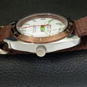 This watch has a stainless steel case in great condition with almost no flaws. The face features Green accents on a White Face giving an awesome vintage look overall.