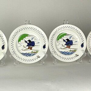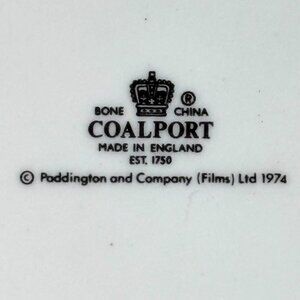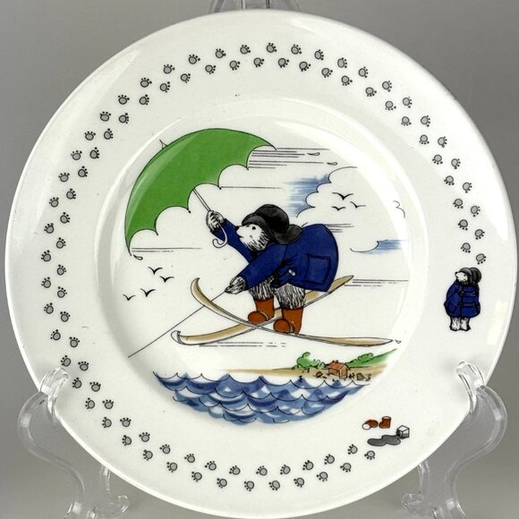 This charming set of four vintage Paddington Bear plates by Coalport is a delightful piece of history for collectors and fans alike. Made in England in 1974, these bone china plates feature whimsical illustrations of Paddington Bear, including the memorable scene where "Mrs. Bird's umbrella shot open and Paddington rose higher and higher into the air." Each plate is bordered with paw prints, adding a playful touch to the design. The plates measure approximately 7 inches in diameter and are part of the now-discontinued Paddington Bear collection designed by Angela Fox.
