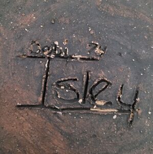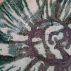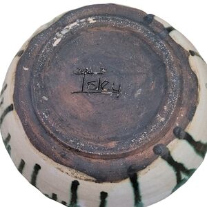 Excellent pre owned condition. Vintage - 1974 Green and White Salt Glaze Red Ware Signed Bowl. 10" circumferencen3" deep. Signed by Debi Isley