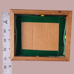 Two adorable 5 x 7 framed, finished needle points each with a teddy bear in a scene, lovingly executed from a kit made in the mid 1970s. In one, there is brown bear with a pink dress sitting in flowers with a butterfly overhead, and the other has a yellow bear dressed in a train conductor shirt and hat playing with a train that looks like it blows bubbles. The frames are dark stained matte wood with thick sides and beveled faces. Great condition!