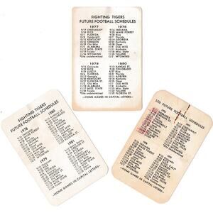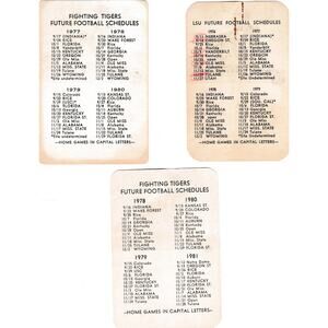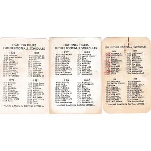 Set of 3 vintage pocket football schedules from 1975, 1976, and 1977 featuring the LSU Tigers. These schedules are in vintage condition, with scores and notes written on them, one has rust mark from paper clip (see photos), adding to their unique character. Please refer to the photos for a detailed look at their condition.