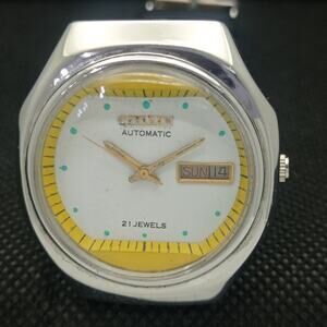 Vintage 1975 Citizen Automatic Mens Silver Watch W/daydate & Yellow accents