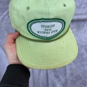 Vintage 1975 Wyoming Open Sponsor Cowboys Pokes Light Green Strapback Hat Cap VTG Retro. The hat is in fair vintage condition. Has a great shape and fit. Will be shipped in a box. See photos for extra details. Feel free to message me with any questions.