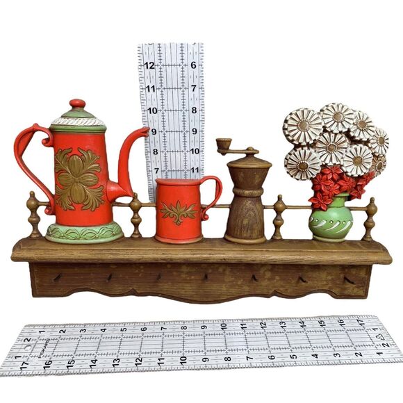 This hard plastic wall hanging features a faux wood shelf with seven functional hooks and colorful kitchen-themed 3D sculpting—coffee pot, mug, grinder, and vase of daisies in Homco-style glory.