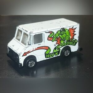 This vintage Hot Wheels van is a must-have for any collector. Made by Mattel in 1976, this diecast model features The Incredible Hulk character and is a great addition to any toy collection. The van is white in color and when you look through the back of the van you can see a picture.