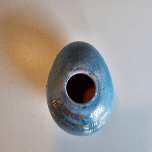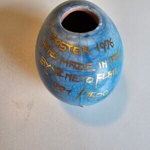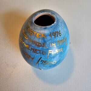 Vintage Easter 1976 Veneto Flair painted egg made in Italy. Beautiful blue egg with pink cherry blossom looking flowers. Signed on the back. Comes with gold tone stand. Great collectible piece, excellent gift.