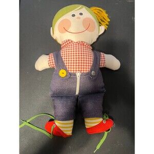 Dapper Dan features yarn hair, embroidered facial details, a red gingham shirt, denim overalls, and red shoes with green laces. Each part of his outfit helps teach an essential skill: brushing hair, buttoning and snapping overalls, zipping up and down, and tying shoelaces. Soft cloth body makes him perfect for cuddling or nostalgic display.