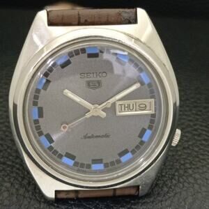 This watch has a stainless steel case in great condition with almost no flaws. The face features Blue accents on a Gray Face giving an awesome vintage look overall. It also has a date function!