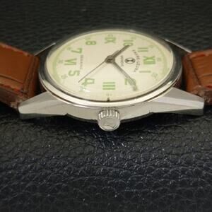 This watch has a stainless steel case in great condition with almost no flaws. The face features Green accents on a White Face giving an awesome vintage look overall.