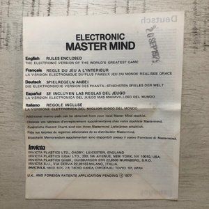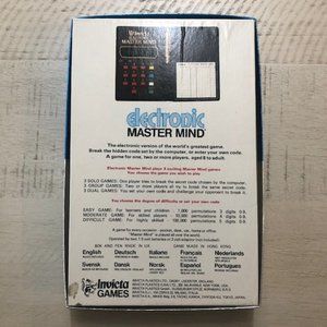 Rare, vintage like new Electronic Mastermind. The electronic version of the world's greatest game. Break the hidden code set by the computer or enter your own code. 100% complete to include electronic game, carrying case, scorecards and instructions. Instructions in English, Spanish, French, German and Italian. Game tested and in working condition. See photos for details. A game for one, two or more players, ages 8 to adult. Stored in smoke free environment. Game well packaged for shipping. We ship fast!