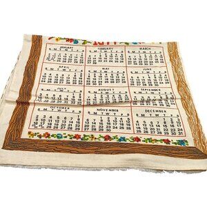 This 1977 calendar towel showcases a rustic kitchen scene with vibrant cross-stitch designs. A nostalgic piece perfect for vintage enthusiasts or home decor collectors.