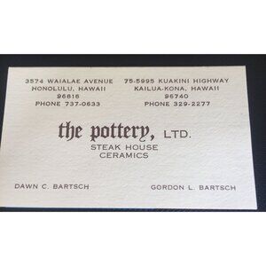 We also have the history of their pottery, a copy of the original menu, and an original business card. Whom ever purchases any of our The Pottery Hawaii items will receive a copy of all three.