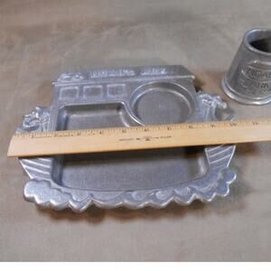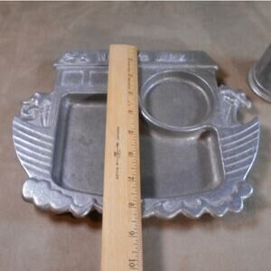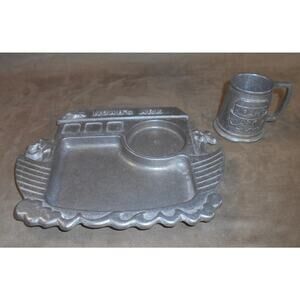 Vintage 1977 York Metal Noah's Ark Plate and Cup Set Pewter Child Dinnerware. Very heavy duty child's dinnerware set features Noah's Ark. Set comes with divided tray/plate and cup. Plate measures approximately 10 inches by 8.5 inches. Cup is approximately 3 inches tall. Set is made from pewter metal. It is signed and dated on plate York Metal 1977. Please see pictures.
