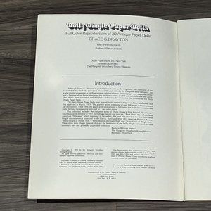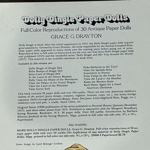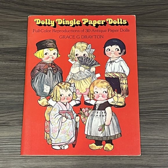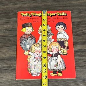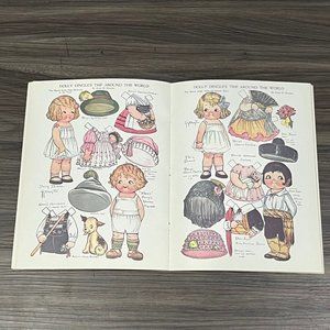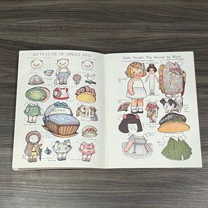 This is a vintage 1978 paper doll book from Dover featuring the Dolly Dingle paper dolls based on the Pictorial Review magazines from the early 1900s. From Grace G Drayton and book contains 30 paper dolls and over 100 outfits. This book is a trip around the world theme and features outfits from different countries. Everything is uncut and book measures approximately 9.25 x 12.25 inches long.