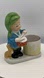 Add a touch of nostalgic charm to your holiday decor with this vintage Jasco "Christmas Luvkins" figurine. Dating back to 1978, this hand-painted piece features an adorable drummer boy (or elf) wearing a green stocking cap and blue coat, playing a red drum. He is accompanied by a small brown bunny rabbit at his feet. The figurine doubles as a candle holder, featuring a hollow "tree stump" or basket style container with dripping white "snow" icing, perfectly sized for a small votive or taper candle.