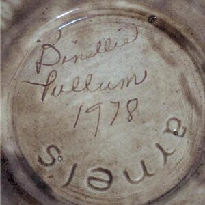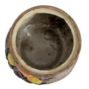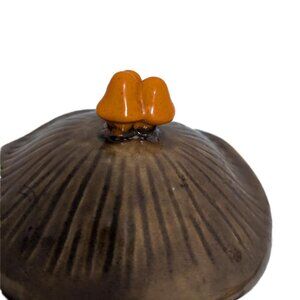 This vintage kitchen canister was made by Arnel's Ceramics in 1978 and features a raised mushroom design on the front and back. The top is shaped like a mushroom cap. The handle for the top is 3 more mushrooms. The bottom is stamped: Arnel's and is signed "Binellie Pullman, 1978," which may have been the person who painted the canister.