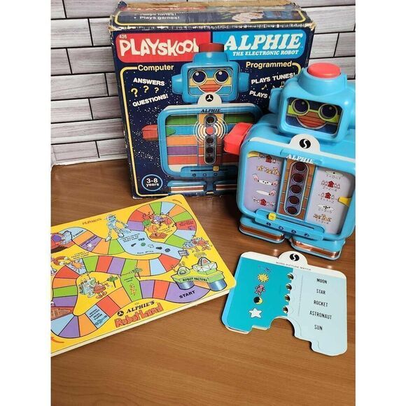 Vintage 1978 Playskool Alphie. Tested and working in original box but incomplete with no instructions. Features 2 board game cards and 11 two sided activity cards. Some of the activity cards do show wear such as tears and writing. These flaws are visible in photos. Robot measures approximately 10 inches tall. Original box included. Preview pictures for a visual description before purchasing.