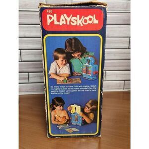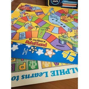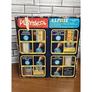 Vintage 1978 Playskool Alphie. Tested and working in original box but incomplete with no instructions. Features 2 board game cards and 11  two sided activity cards. Some of the activity cards do show wear such as tears and writing.  These flaws are visible in photos. Robot measures approximately 10 inches tall. Original box included.  Preview pictures for a visual description before purchasing.