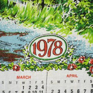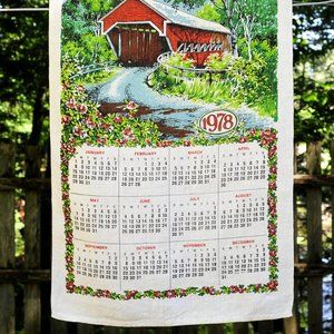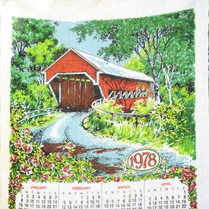 Vintage 1978 Red Covered Bridge in Spring/Summer w/ Flowers Calendar Tea Towel