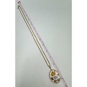 Long 24” chain with diamond shape Sarah Cov hang tag. Pretty floral pendant does have discoloration on the back and on the edge of front please see photos. Length of pendant from bale is 2.25”long & 1.25” wide.