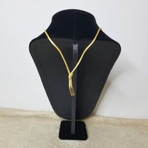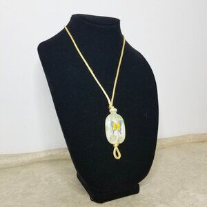 Hand painted butterfly ceramic on yellow satin cord. 27" length with knot tied as shown.
