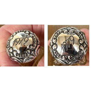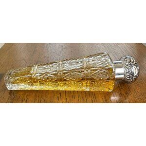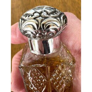 Very beautiful & ornate glass bottle & silver colored top that looks/feels like metal? Not sure. Bottle topper is very pretty as well with pretty designs & has "1979" imprinted on top of bottle