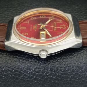 This watch has a stainless steel case in great condition with almost no flaws. The face features Gold accents on a Red Face giving an awesome vintage look overall. It also has a date function!