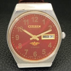 Vintage 1979 Citizen Automatic Mens Silver Watch W/daydate & Red accents