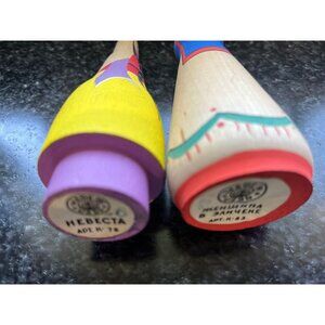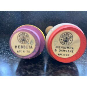 Vintage 1979 Pair of Russian Wooden Folk Art Dolls "Hevecta" & "Woman In Eliceke" Original Labels Made In USSR Hand Painted