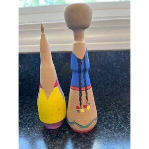 Vintage 1979 Pair of Russian Wooden Folk Art Dolls "Hevecta" & "Woman In Eliceke