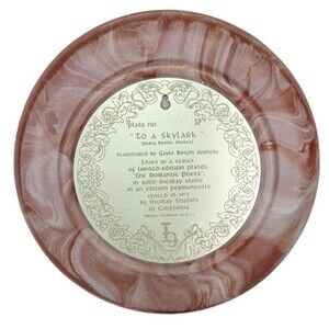This vintage 1979 collector plate is a stunning piece of art that will add elegance to any room. Crafted by Gayle Bright Appleby, this solid incolay stone plate features a beautiful 3D design titled "To A Skylark". The plate is from Incolay Studios of California and has a pink color that complements any decor. This plate is perfect for all occasions and will make a great addition to your collection of decorative collectibles. The material of the plate is solid incolay stone and it has a decorative style that will enhance any space. Add this unique piece to your collection today! no. 09082 measures approximately 10" diameter