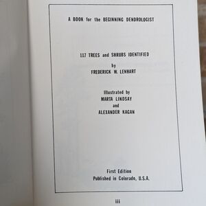 A Book for the Beginning Dendrologist. This is a first edition of "117 Trees and Shrubs Identified" by Frederick W. Lenhart. Illustrated by Marta Lindsay and Alexander Kagan. Published in Colorado, USA in 1980. Great preowned condition with light wear on cover (pictured) and a clean interior.