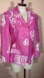 Stunning shimmering magenta pink blazer with a pure white almost hand painted design on a retro blazer. Designed with an oversized fit with power shoulders a slightly nipped in waist and a three button closure with long sleeves and a lapel. Like many of christian Lacroix pieces the most amazing part of the jacket is the fabric which is a light which organza like fabric with a shimmer that reflects the light with a semi sheer lining. Pure white ethnic like paint creates a contracting and captivating Print. this blazer is complete with faux flap pockets and a sparkling buttons. This blazer gives a real hour glass silhouette that is Perfect for day or night.