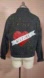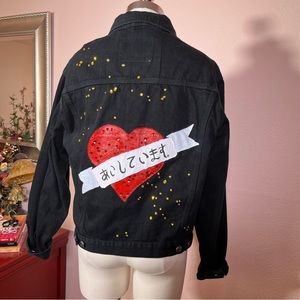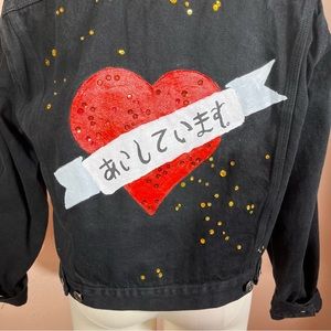 Unique embellishment of sparkly red and gold sequins, and hand painted Heart and Japanese love note all on a oversized Black jean jacket. Sweet biker vibe with a classic trucker style cut with slit and top pockets, side buttons and long sleeves that beg to be rolled up. Tattoo design Heart has hand written Japanese letter that says ‘I Love You’. Made with Heavy dark Dyed Black Denim.