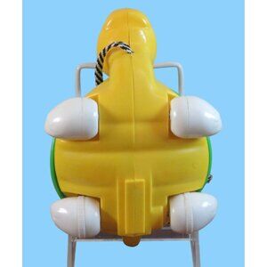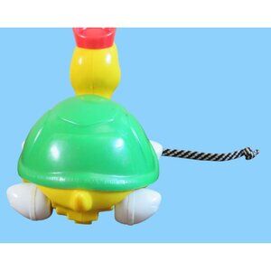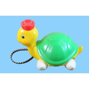A delightful vintage pull-along turtle toy from 1980, crafted by Blue Box. This charming plastic toy features vibrant colors and a nostalgic design.
