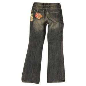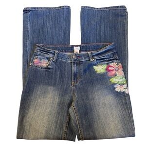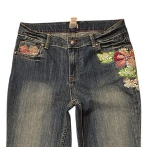 Fabulous Find! In excellent condition! Y2K Vintage 1980 luxury brand Cache sexy low rise flared denim jeans. Elaborate embellishments include beading, sequins, embroidery and bronze floral button/studs…no detail is spared! Cotton/poly/spandex blend adds a little stretch. AND these have a glorious 34” inseam to accommodate platforms and stilettos!