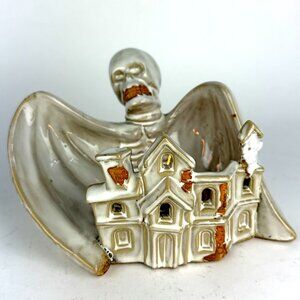 Vintage 1980 Ceramic Skeleton Haunted House Tea Light Candle Holders and candle