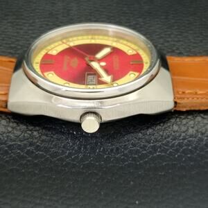 This watch has a stainless steel case in great condition with almost no flaws. The face features Gold accents on a Red Face giving an awesome vintage look overall. It also has a date function!