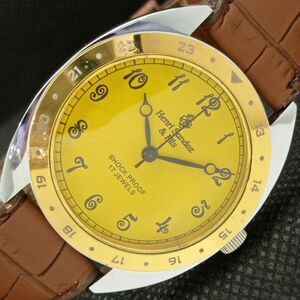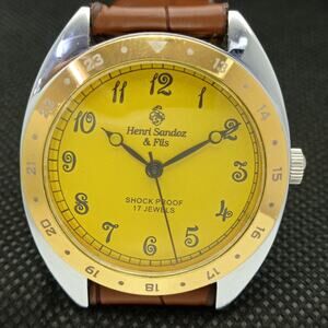 Vintage 1980 Henri Sandoz Manual Mens Silver Watch W/Leather Strap & Gold accent