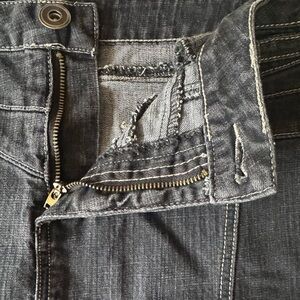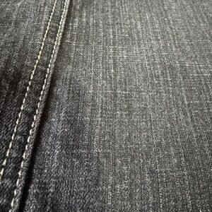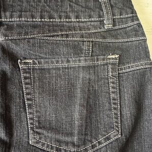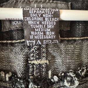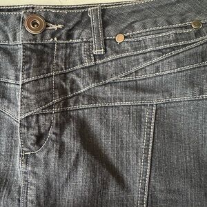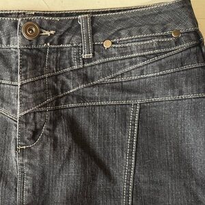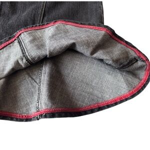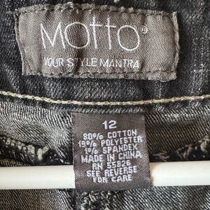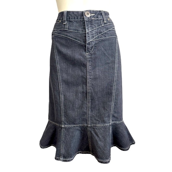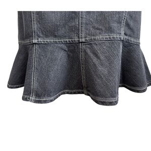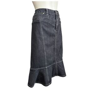 Pristine condition. Vintage black denim Motto skirt is pieced/seamed for shaping with a fun flounce at the bottom. Two front coin pockets, two rear pockets. Front zip/button. True color is a faded black with off white top stitching. Depending on your height, the skirt hits several inches below the knee or midi length.