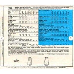 Vintage 1980's McCall's 7229 Sewing Pattern. Misses Skirts: Gathered skirt A or B without side seams has openings below buttoned waistband, pockets are part of lower side sections. Skirts C and D have left side zipper and hooked waistband.