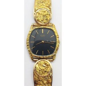 This Listing is for an elegant vintage 1980 Seiko Quartz gold nugget embellished men's wristwatch in good working order with a new battery installed. This beautiful watch is embellished with real gold nuggets and is quite an eye-catcher. Please take a look at the pictures to judge the condition for yourself. This will fit a size 6.75 inch wrist. This would make a marvellous gift for that special someone or addition to one's fine jewellery collection. The watch you see in the photos is what you will receive. Do not miss out on this amazing item. If you have any questions, please feel free to send an email. Thanks for looking.