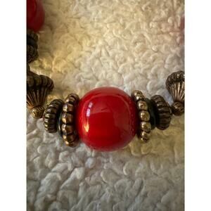 Beautiful and classic statement piece with red, black and bronze tone dividers. Measures 11” in excellent condition with screw closure.