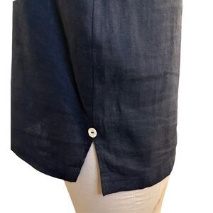 This classic linen top features a simple, round neckline and a relaxed fit, making it suitable for casual wear. It has a button detail on the side vents.