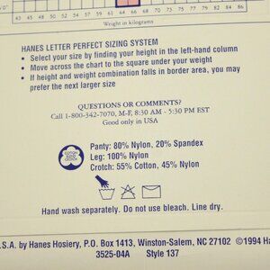 New old stock vintage pantyhose, circa 1980s 1990s by Hanes Too. Listing is for one package. These are Control Top Sandalfoot in color South Pacific. There is a tag that says Style 137 and Size AB which seems to be the small based on the code on the back. The photos have a close up of the size breakdown for your reference.